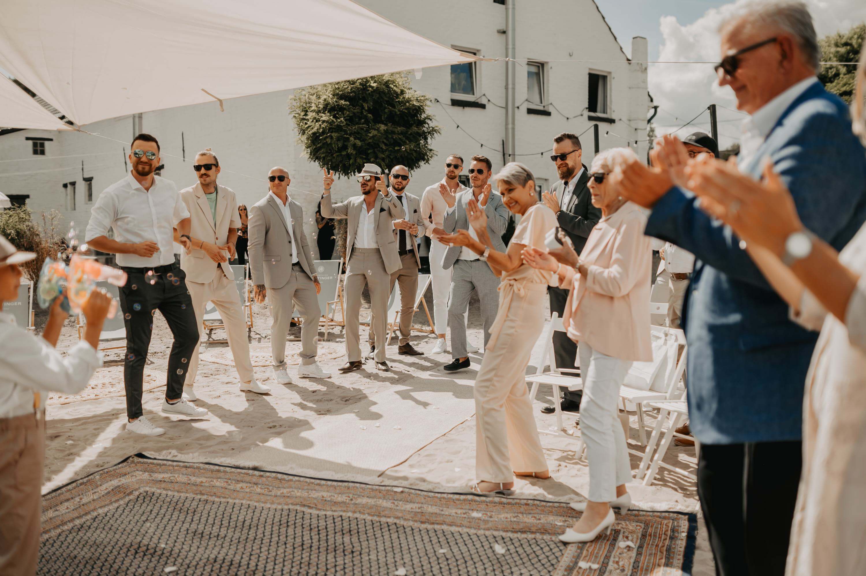 Auf der riesigen Sandfläche mit Schiff und Sonnensegel warteten bereits die Gäste. Der Einmarsch des Bräutigams war dann besonders aufregend. Er kam tanzend begleitet von seinen Jungs mit Partymusik Richtung Trauredner gelaufen.